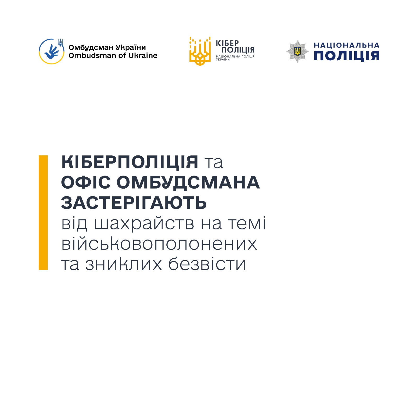Кіберполіція та Офіс Омбудсмана звертають увагу громадян на шахрайства, пов’язані з темою звільнення українських воїнів та пошуку безвісти зниклих людей. Зловмисники користуються вразливим емоційни...