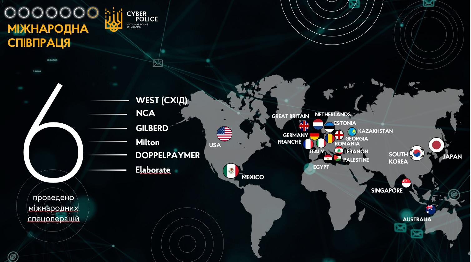 Кіберполіцейськими ініційовано та забезпечено активну участь у проведенні 9 міжнародних поліцейських операцій, за результатами яких задокументовано протиправну діяльність учасників хакерських угрупувань, з яких 6 успішно реалізовано.