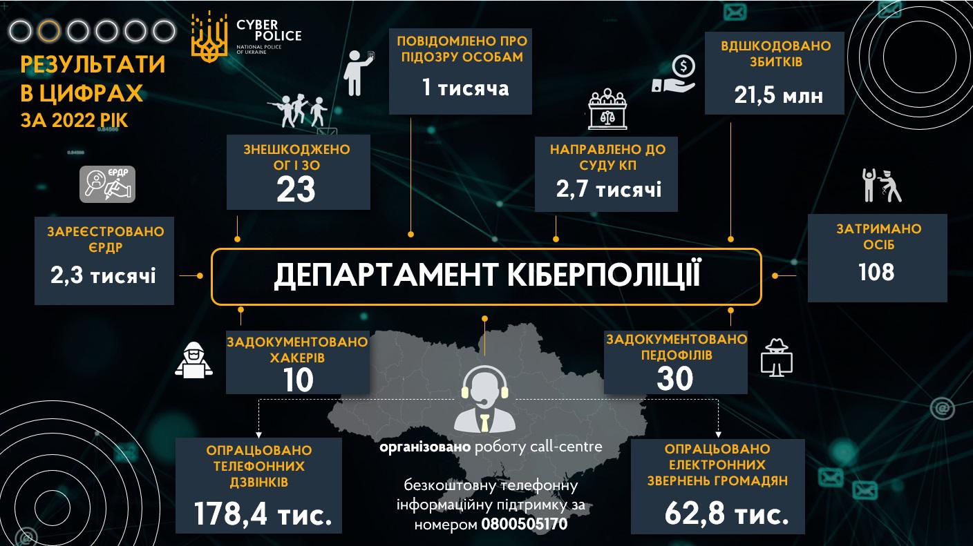 У 2022 році кіберполіцейськими здійснювалось супроводження 5 тис. кримінальних правопорушень, виявлено 2,3 тис. кіберзлочинів, повідомлено про підозру 1 тис. особам за вчинення 2,3 тис. кримінальних правопорушень. Затримано понад 100 кіберзлочинців, задокументовано та притягнуто до відповідальності 30 педофілів та 10 хакерів. До суду з обвинувальними актами скеровано 2,7 тис. кримінальних правопорушень за обвинуваченням 840 осіб.
