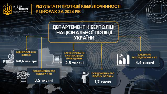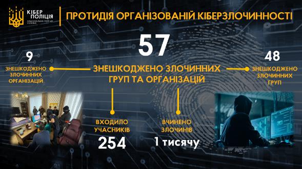 Так, у 2024 році на напрямку протидії організованій кіберзлочинності знешкоджено 57 організованих груп (з них 9 – злочинні організації), до складу яких входило 254 учасники, які вчинили понад 1 тис. злочинів.