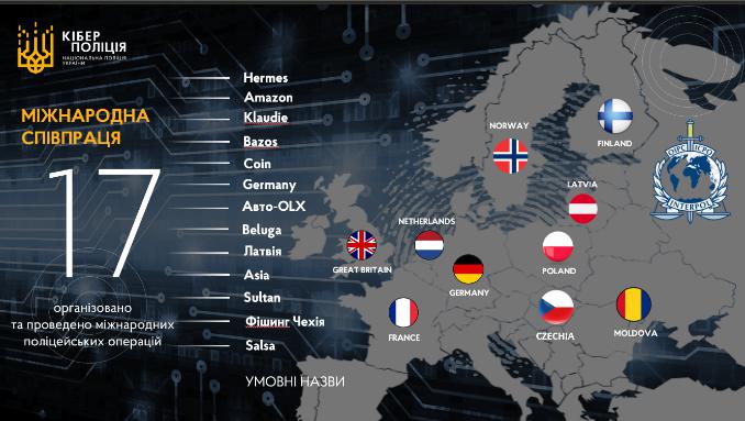 Спільно з іноземними колегами українські поліцейські ініціювали та забезпечили участь у проведенні 17 міжнародних поліцейських операцій. У результаті було нейтралізовано загрозу з боку кількох потужних хакерських об’єднань, злочинна діяльність яких охоплювала країни усього світу.