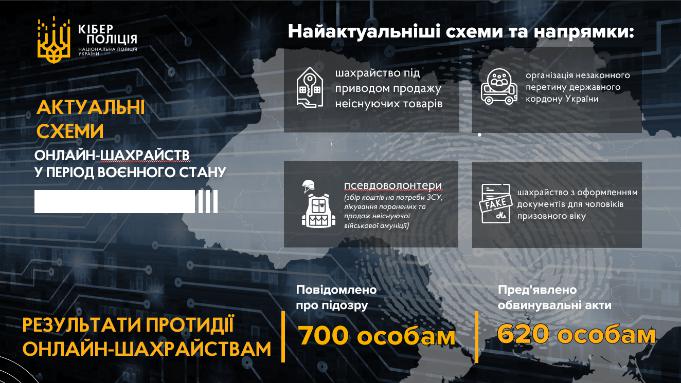 Слід зауважити, що за час дії воєнного стану зловмисники підлаштовувалися під тренди суспільства, тому набули поширення заволодіння коштами громадян під виглядом надання послуг з оформлення документів для чоловіків призовного віку, незаконного перетину кордону, шахрайства, пов’язані із продажем військового спорядження та наданням волонтерської допомоги, оренди квартир для внутрішньо переміщених осіб, їх перевезень в безпечні регіони.